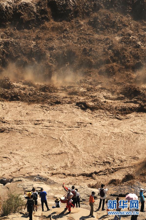 8月26日,游客在壺口瀑布景區(qū)欣賞鑼鼓表演。近日,受上游降雨和水庫泄洪影響,黃河壺口瀑布水量增大,形成壯美瀑布群,吸引眾多游客觀景賞瀑。新華社記者馬毅敏攝