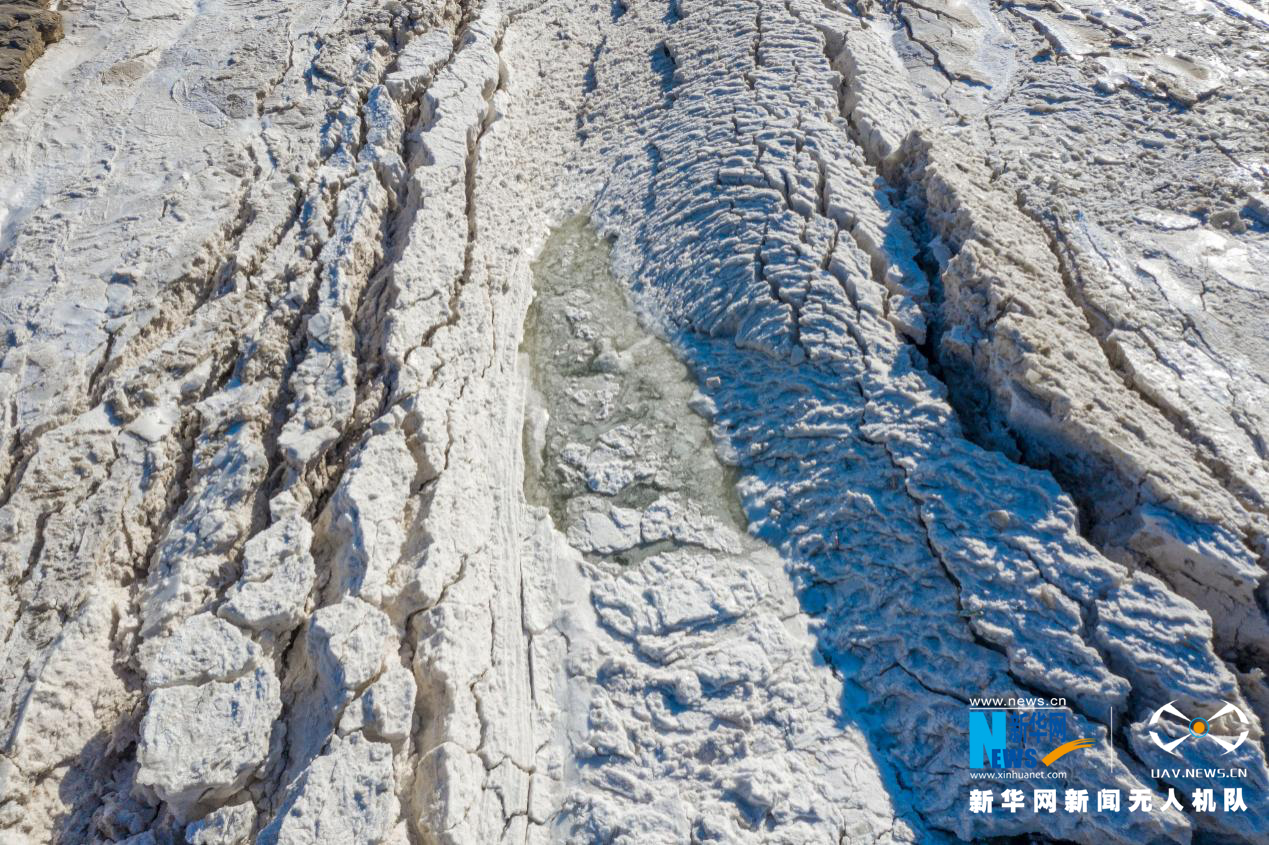 無人機(jī)視角下的黃河壺口瀑布十里冰河景觀。宋洋波攝近日,隨著氣溫的持續(xù)降低,位于晉陜大峽谷的陜西黃河壺口瀑布水量減少,冰層增厚,十里龍槽狹窄河段相互凝結(jié)擠壓,形成十里冰河,景色蔚為壯觀。(楊喜龍)