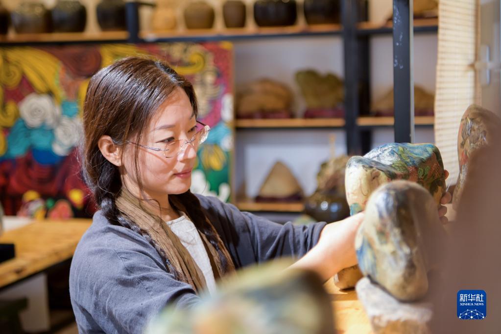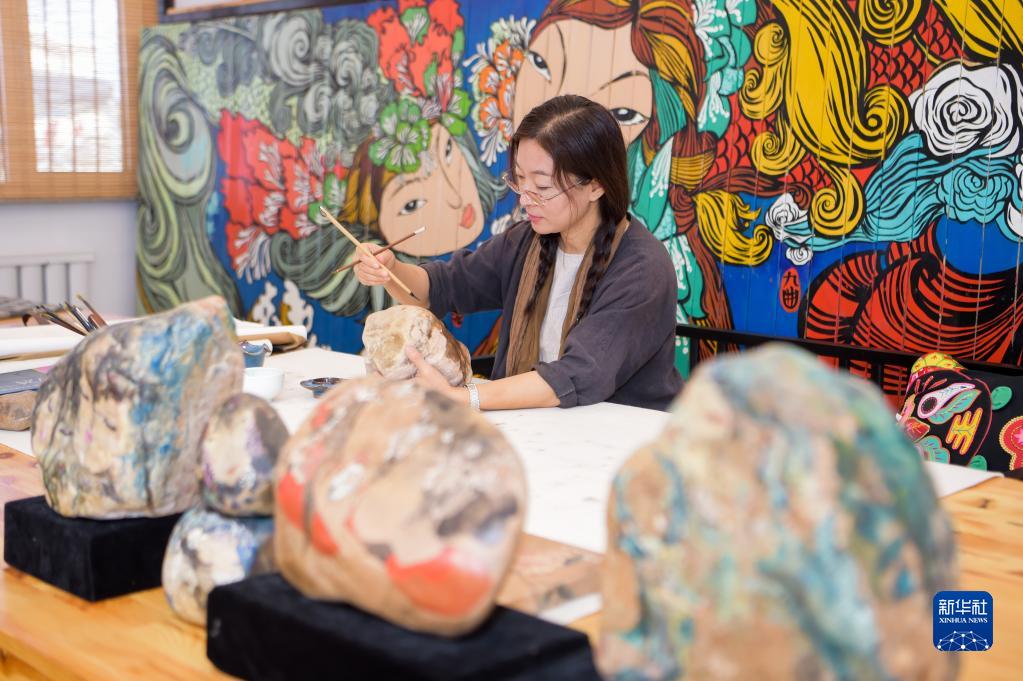 8月26日,在位于內蒙古烏海市海南區(qū)黃河西行客棧的工作室內,魯婷在進行黃河石彩繪創(chuàng)作。